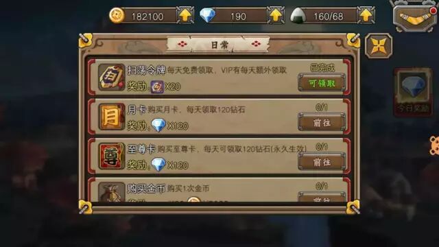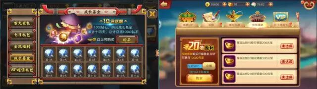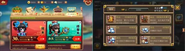 月卡。为了刺激玩家每天登录和充值,游戏中普遍会设计月卡,一般是花费25-30元,购买月卡,购买月卡用户每天可以领取120-150钱币,并且每天可以领取月卡体力礼包,这种设计让用户感觉购买月卡非常超值,如果使用25元购买钱币,可以获取250钱币,如果购买月卡,则可以获得120*30=3600钱币,而玩家一旦购买月卡,又形成存量绑架,承诺一致和损失厌恶。