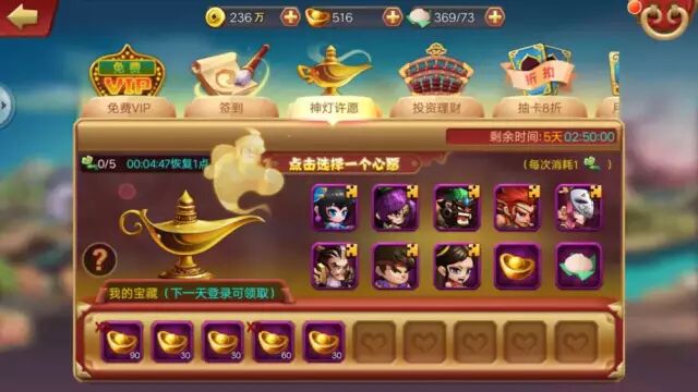 阿拉丁神灯--次日活跃利器。这是我见过的一个比较有趣的设计,既可以提高玩家平均停留时间,也可以刺激玩家的次日活跃和7日活跃。游戏中设计了一盏阿拉丁神灯,开服7天内有效,每5分钟可以获取一个许愿如意,上限是5个,展示了10个许愿位置,10个可选许愿礼物,每次许愿消耗许愿如意,用户要完成每天的10次许愿就必须耗费50分钟时间,而这些都是玩家的存量,如果玩家第二天不登录游戏,那么许愿礼品就没了,所以玩家就会第二天登录领取礼品,同时完成新一轮的许愿任务。这个设计可谓一举多得,每天至少50分钟在线时长,培养用户登录习惯,次日需要登录领取昨日奖励,存量绑架+损失厌恶,这些时间还需有大量其他设计诱惑玩家追加投入时间。