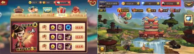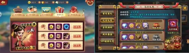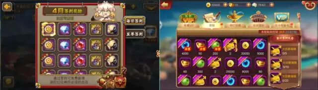 每日签到。游戏中的签到经常与VIP等级相关,我们先来看下面几张游戏每日签到任务截图,从图中我们可以看到,签到页面结构类似,设计思路是累计签到时间越长,奖励越丰富,签到奖励均可见,VIP等级不同可以领取翻倍奖励。