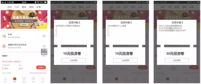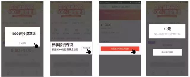 我们可否考虑在非游戏应用和服务中设置新手任务?可否考虑通过鼓励用户的行为,给用户一种进化和成长的体验?可否考虑优惠卷不是一次性给付,而是做成倒计时礼包,让玩家有时间多看看平台的内容?我们依然以P2P理财产品为例,简单设计一个新手任务,引导用户提高平均停留时间。下面简单设计新手操作引导原型,用户首次注册登录,赠送用户4500元投资基金,用户点击新手投资专属投资品,消耗投资基金,完成投资,提示用户次日可领取收益10元红包,用户如果想要将红包提现,则至少需要完成绑卡充值,并真实投资100元。次日红包刺激用户第二天登录平台,后面会详细介绍。