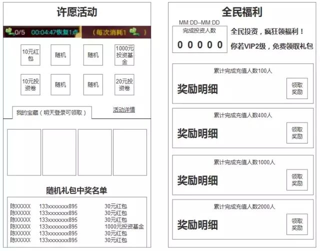 因为游戏中的道具和礼包边际成本为零,所以很多超额礼包不适合非游戏类产品使用,但是设计思路可以借鉴,其中的首充全民福利和阿拉丁神灯就是可以参考的设计,我们依然以P2P理财产品为例,设计刺激用户活跃的方案。首先来做一个类似于阿拉丁神灯的设计,可以考虑设计6-8个备选项,每隔5分钟可以许愿一次,许愿礼品次日可以领取,建议设计随机礼券,用户可以抽取随机奖励,下方滚动展示获取高额随机礼卷的用户获奖信息,刺激用户参与活动,并促进次日登录。全民福利活动可以设置成根据投资人数领卷,数值可以根据应用的现有投资活跃人数进行设置,可以将领取门槛提高,比如投资2000元的VIP2才可以投资,下面原型的数字均是随意编辑,具体数值应该结合平台具体数据设计,奖励设置根据ROI进行设置,如果平台注册并投资用户占比30%,通过观察活动数据,看是否可以拉升注册并投资用户占比,建议参考微信的策略,多版本定向投放,根据数据决定优化方向和最终功能。