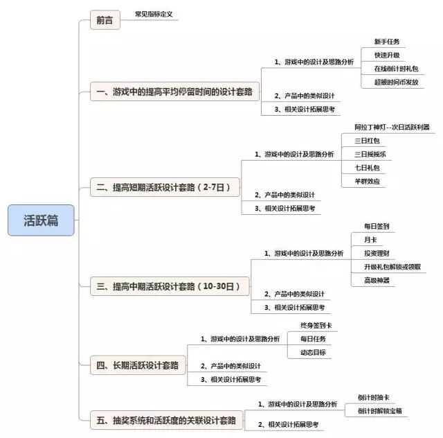 本文讨论话题将围绕五个话题展开,分别是游戏中的提高平均停留时间的设计套路,提高短期活跃设计套路(2-7日),提高中期活跃设计套路(10-30日),长期活跃设计套路,抽奖系统和活跃度的关联设计套路。本文的整体结构框架将延用以往结构:游戏中的设计及思路分析,产品中的类似设计,相关设计拓展思考。整体结构如下图所示: