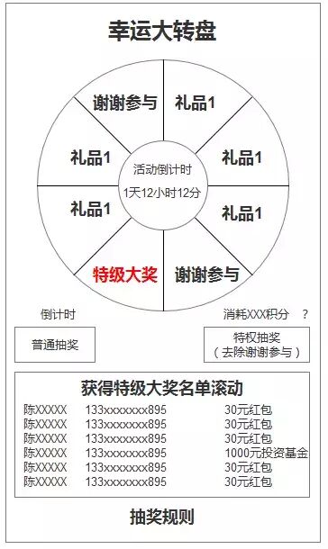 结合上文中的设计思路,我们来看看非游戏类互联网应用和服务中如何设置抽奖系统,可以即拉升活跃,又提高收入。抽奖设计需要有几大重要元素:随机性,通过消费可多次抽奖,抽奖设置倒计时,其他用户得奖结果可见,奖品中有用户期望礼品,页面操作简单,奖品展示直观,获奖动画酷炫。辛运大转盘如下图所示,普通抽奖可以通过在线时间领取,每天3次,特权抽奖可以设置成VIP2级以上可以使用,使用后谢谢参与选项消失,提示特级大奖中奖概率翻倍。中奖动画设计参考游戏中任务抽奖页面,屏幕变暗,奖品从天而降,可以考虑设计一个随机礼包,进一步刺激用户抽奖,抽奖可以让用户消耗红包或者钱币,而得到的投资卷或者投资基金用户需要追加投资才可以转化为红包。