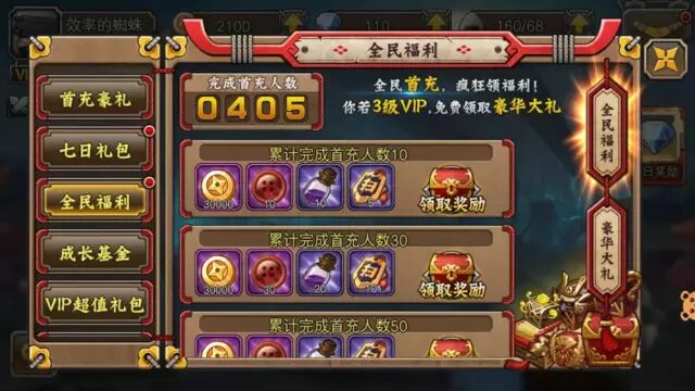 羊群效应。也叫“从众效应”,是个人的观念或行为由于真实的或想象的群体的影响或压力,而向与多数人相一致的方向变化的现象。游戏中会通过告知在线玩家数量来让玩家有一种很多人在玩的错觉,下一期会详细谈到游戏中的机器人设计,通过机器人的设计,可以让玩家感觉有很多并肩作战的战友,进而一直战斗下去。下面的游戏设计将VIP等级,羊群效应和首充礼包奖励三大手段用到极致。首先,新开服后充值人数飙涨,通过领奖页面,告诉玩家大量用户正在充值并且充值人数持续增长,给玩家一种所有人都在充值的错觉,诱导用户充值。其次,礼包奖励丰厚,任何玩家都可以领取,通过领取礼包,引导玩家不断查看领取页面。最后,提示VIP3级可以领取更加豪华的大礼包,刺激玩家充值成为VIP3级玩家。