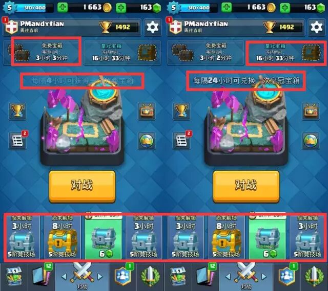 倒计时解锁宝箱。《皇室战争》中没有时间币的设置,但是游戏中充斥着钱币购买时间的交互引导,每4小时一个的免费宝箱,上限是2个,刺激玩家每8小时登录一次。高级宝箱每24小时领取解锁一次,解锁后需要通过玩家PVP对抗解锁,对抗后会赠送玩家宝箱,赠送宝箱分为3小时解锁,8小时解锁,12小时解锁。玩家点击解锁后需要等待一定的时间,或者使用钱币直接解锁,如果等待解锁,则需要几乎每3个小时登录一次游戏,刺激玩家持续活跃。通过这种倒计时礼包的设计,可以刺激玩家持续投入时间。