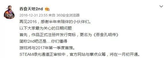 2017年1月份,《吞食孔明传》登录steam青睐之光并在摩点网发起众筹。