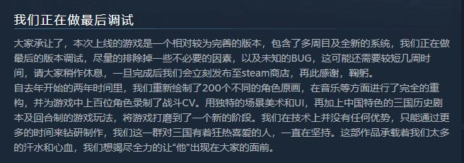 据秀透露,游戏已经开发完成,由于steam的机制问题,一些BUG的出现,导致了10月8日的跳票,这段时间他们一直在做版本调试。上次的风波让他们意识到运营的重要性,他们也想借此机会多学习一些运营知识,再把游戏上架,避免事故重演。
