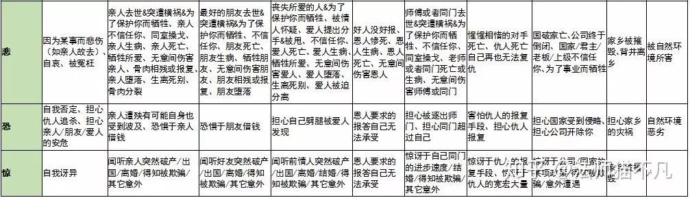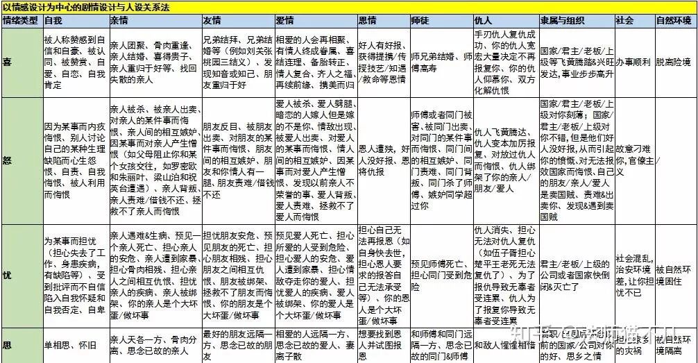 编排这张表格的目的在于:当需要让人感受某种情绪时,则根据需要体验的情感编排剧情和情节。换句话说,是一种以情感设计为中心的剧情设计与人设关系法。