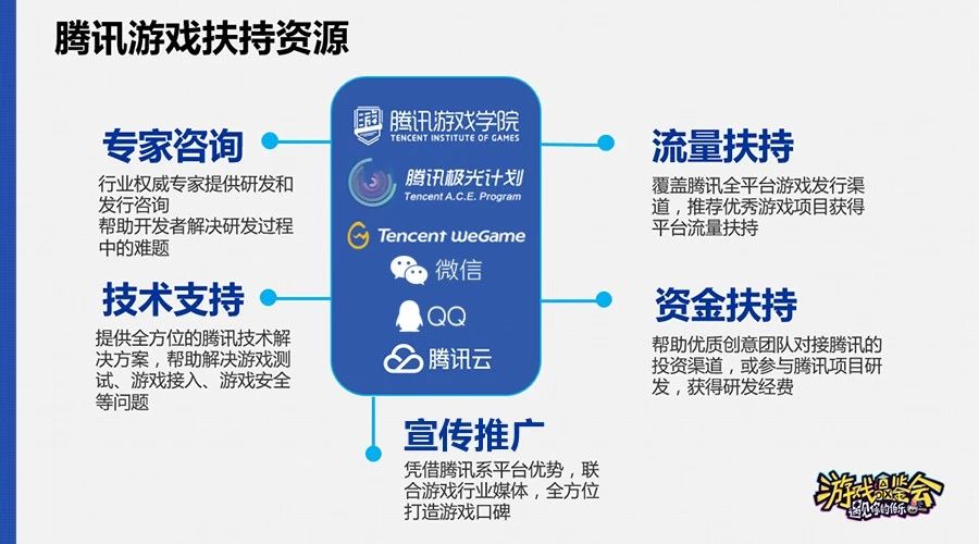 本期品鉴会上,腾讯游戏学院·游戏项目扶持业务负责人丁芸着重介绍了腾讯游戏的扶持资源。她表示,腾讯游戏学院搭建扶持平台,为行业优秀的创意团队提供专家咨询、技术支持、流量扶持、资金扶持、宣传推广等五大服务,力求更好地帮助创意团队在研发早期和腾讯对接,获取腾讯独有的研发和发行的资源。