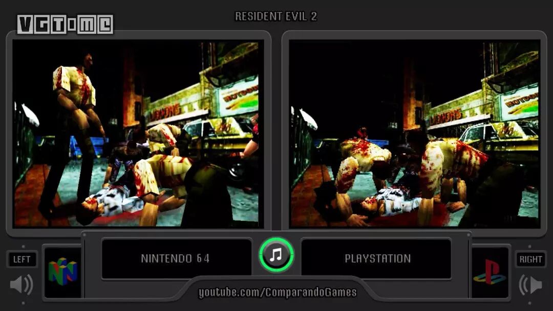 当时也有从 PS1 移植到 N64 的作品,比如《生化危机2》。为了把耗容两张 CD 的游戏缩小成 64MB,负责移植工作的 Angel Studios(RAGE 引擎开发小组)采取了暴力的有损压缩,主要表现在视频和动画上。PS1 采用了 MJPEG 视频格式,这种格式会基于 JPEG 图片生成运动图像,可以单独对某一帧进行压缩,所以压缩倍数能够达到80倍。