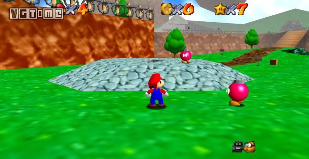 不难发现,《超级马里奥64》中的草地、沙地、树木,甚至主角本身,都是直接在 3D 建模上抹一层色完事。偶尔见到的石堆和城堡,大概是为数不多用了贴图的地方,同时期的 PS1 游戏可是高出了几个档次。