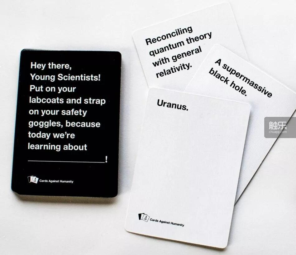 《反人类牌》是个类似《只言片语》(Dixit)的聚会游戏,玩法简单来说就是“完形填空”:每个人轮流坐庄翻出一张“黑色问题卡”,其它玩家则从手牌中打出“白色答案卡”,由庄家根据个人喜好评分,答案越没节操的玩家越容易获胜