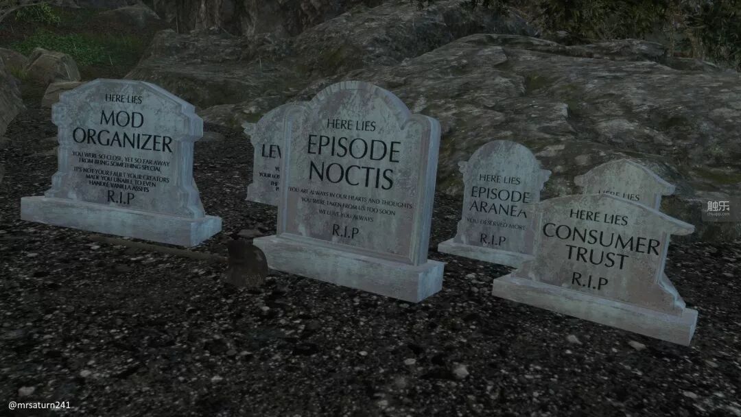 网友用Mod在《最终幻想15》里表达了自己的不满,埋在最右边那块墓碑下面的是“消费者的信任”