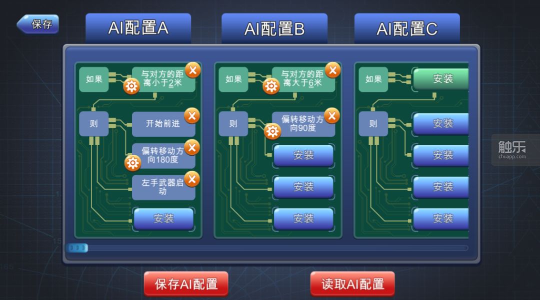 但和同类题材的游戏略有不同的是,玩家在《机擂》中无法操作机器人,而是通过事先编写AI,让机器人在战斗时,基于“触发条件”来执行相应的行动。比方说,玩家可以设定“如果与对方的距离大于1米”,则“左手武器启动”,但若“与对方的距离小于5米”,则“偏转移动方向”。经过设定后,我方的机器人会一边对敌人进行远程射击,一边在敌人靠近自己时自动走位闪避。