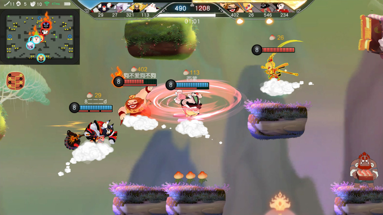 游戏中的角色也不再像传统MOBA游戏,根据坦克、奶妈、DPS划分,而是围绕夺桃来设计。比如有些英雄适合携带桃子逃跑,有些适合半路截杀,而有些则适合为逃跑者打掩护,三者互相牵制,就形成了“追逐战”的核心玩法。在最新的版本中,《闹闹天宫》已经有了近40个英雄。