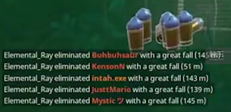 在火箭发射的这局游戏中,通过拆毁其他玩家为了围观火箭发射而搭设的高台,Elemental_Ray让多达48位玩家死于摔落伤害。这名平时战绩平庸的玩家(一场没赢过),凭借这次连续击杀“荣获”《堡垒之夜:空降行动》单场击杀世界第一,领先了当时保持纪录的法国玩家Finest足足15个击杀数。