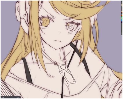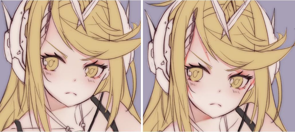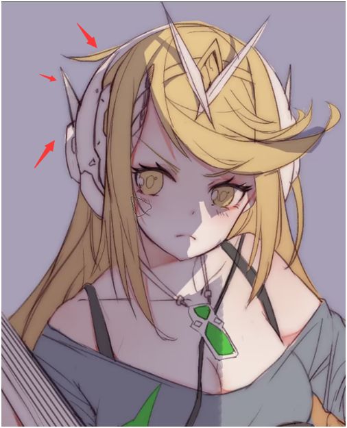 9.眼睛周围也要用这个颜色画一下,让它不那么单薄。如果要体现脸和头发的有距离的话,头发的投影就不要贴着画,这样才有空间感
