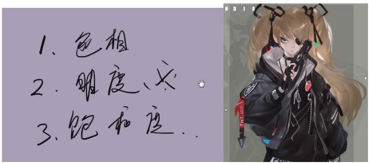 1.首先,这个呢是咋们配色的时候都要有的(如图),一是色相,二是明度,是最重要的一点,三是饱和度,大家记清楚。大家在上色的时候一定要控制自己对颜色的欲望,每个画面里有一个主要的颜色,主色调就好了。