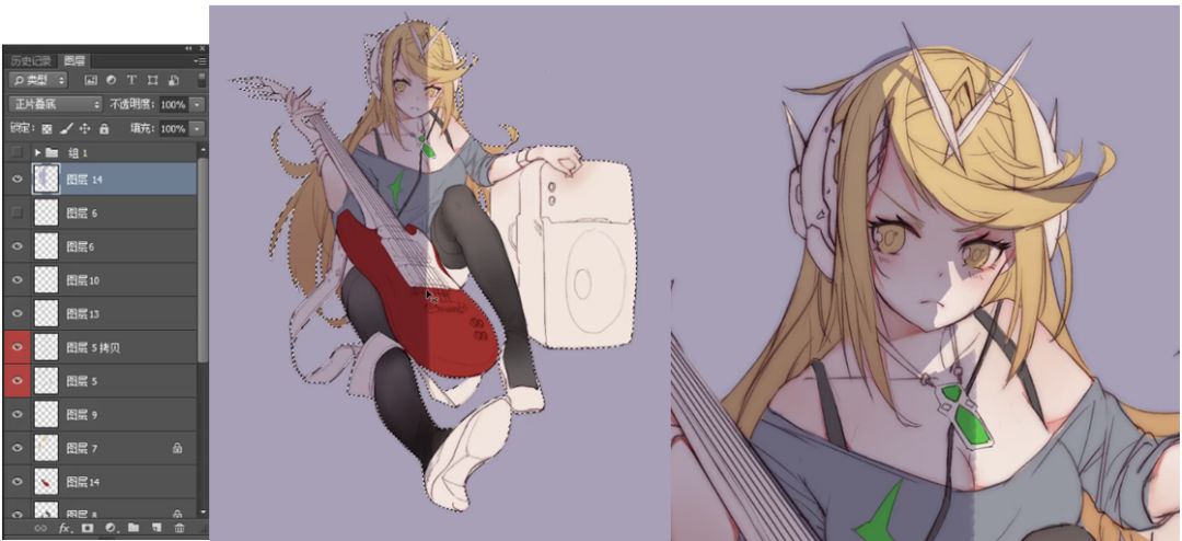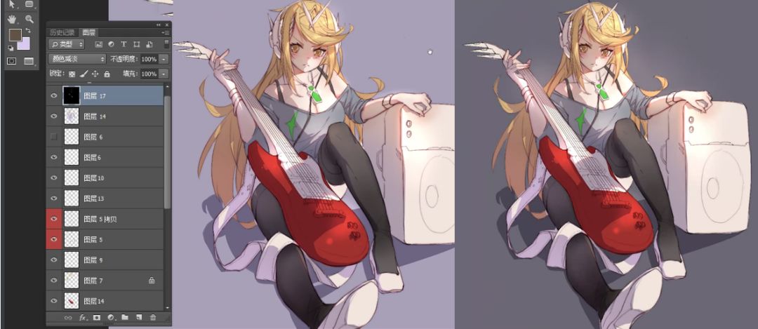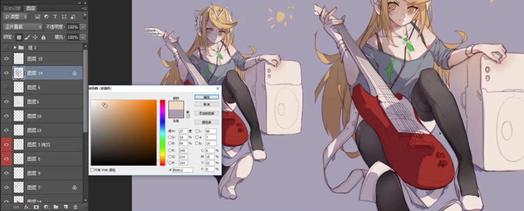8.然后一样是正片叠底这一层,投影的地方给她加一些高饱和的颜色,这些(画面里的)颜色是明度最重的