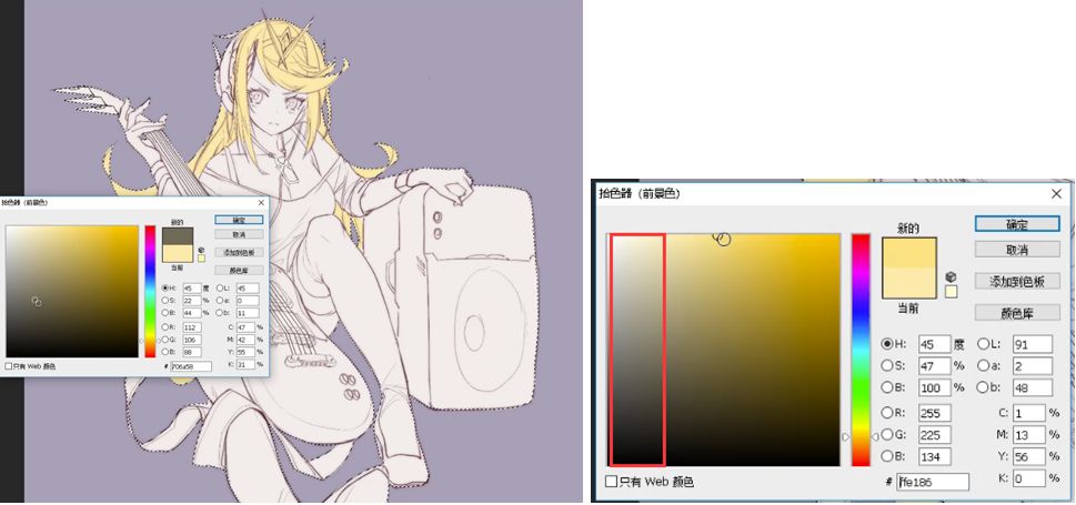 3.一开始上的颜色,尽量在拾色器的四分之一这一边选,尽量不要超过二分之一,高饱和度的颜色咱们是最后画龙点睛的时候才去加的