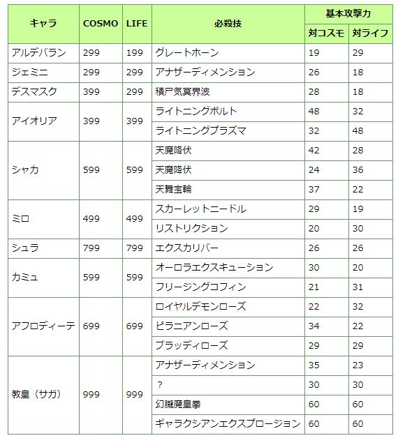 下面这张表格是《黄金传说完结篇》中会与玩家战斗的黄金圣斗士数值,其中小宇宙和生命值因为玩家等级系统的关系,会随进度不断上升,因此没有参考价值。真正可以比较的是这些黄金圣斗士的必杀技数值。