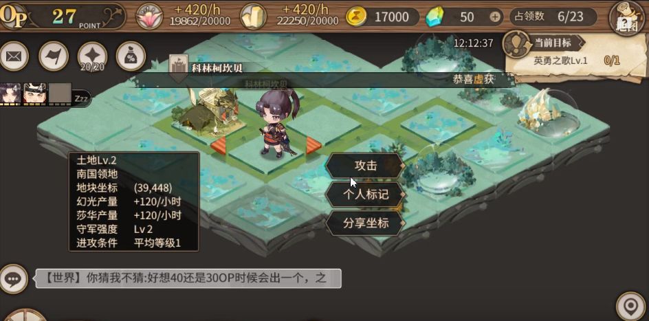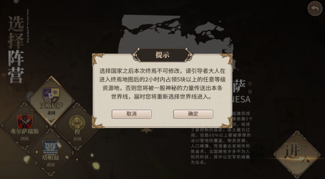 大致来说,《时之歌》的玩法分为庭院养成模式和名为“终焉”的策略模式。“终焉”的部分核心玩法和大部分协作RPG手游的框架相当,玩家开局选择加入四个国家其中之一,开局一块地,资源全靠抢,通过占地来提升资源,然后通过资源来培养自己的战斗阵容,并且升级科技。
