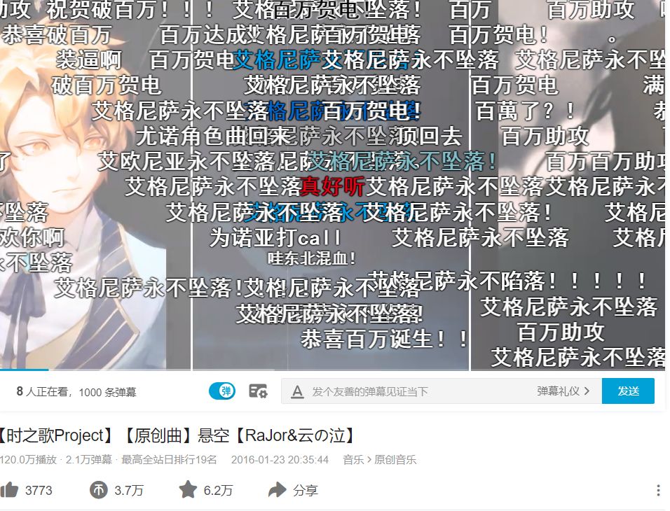 另一个比较有趣的现象是,四国征战、多主角的世界观设定,让用户产生了非常强烈的阵营归属感,整个圈子呈现出一种比较接近粉圈雏形的状态,喜爱时之歌的粉丝大多会根据自己喜爱的角色将自己划归某个阵营,在B站的视频中,弹幕中有大量用户为自己所在的国家阵营刷屏打call,比如“艾格尼萨永不坠落!”。