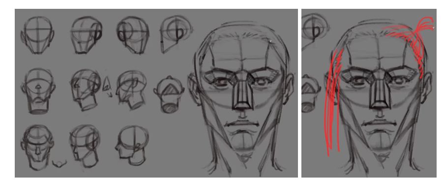 5.有喉结还有稍微细小的结构,还有眉骨的结构,这些是细化的结构,到后面我们刻画一个人的时候结构是很细的。旁边的头发通常情况下是向下的,如果炸了小辫子,就会向(辫子)聚集