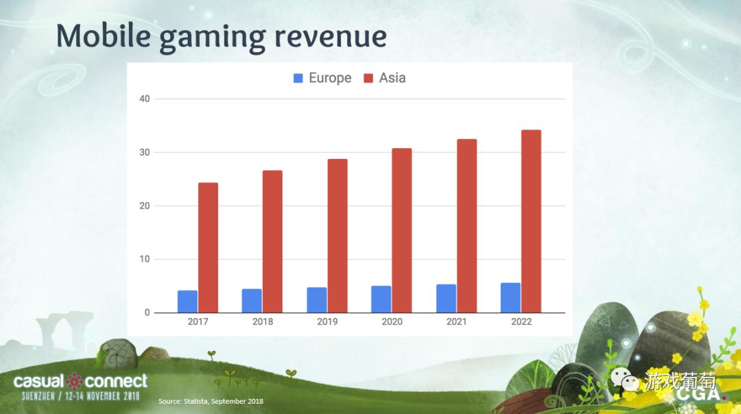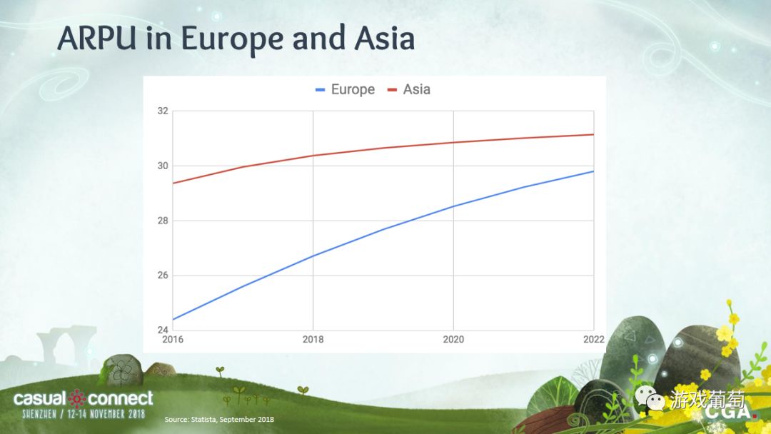 如今,欧洲手游市场的变现率很强,并且在持续增长,东欧和亚洲的变现率现在已经越来越接近了。