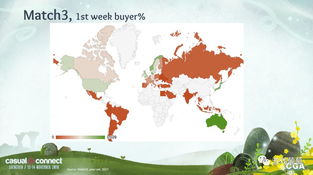 当然,安装并不是最终目的,我们要关注的是变现。英国和德国的安装率之所以一开始没有那么快,不仅和它的转化率有关,也和变现率有关。一般在日本,玩家在7天之内就会安装游戏。在这段时期内,欧洲国家的转化率和变现率都不是特别高,但实际上根据报告显示,欧洲国家的转化很多会在21天内才能发生。所以在思考转化率时,我们要为欧洲国家设置更长的参考时间,要把窗口期延长。
