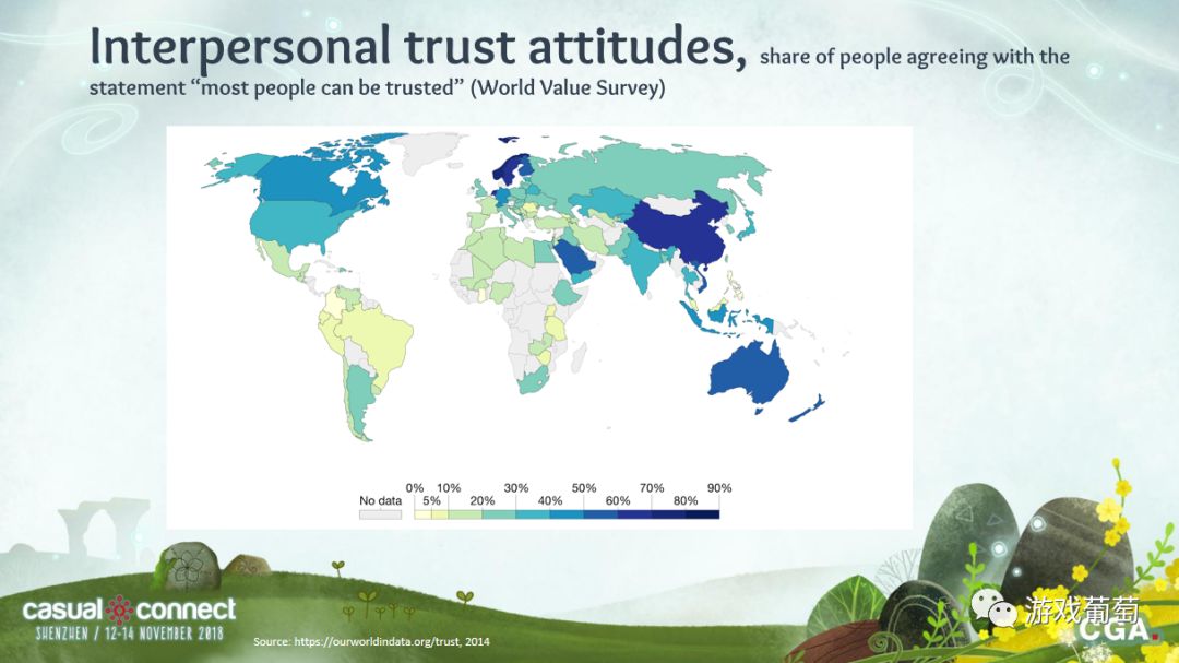 接下来,我们要与用户建立共信。当我们开展宣传攻势或是运营的时候,要考虑到不同地区用户性格的差异。下图数据向我们展示了世界不同地区人际之间互信的关系:在某些国家,大部分人会认为互相之间是可信的,比如中国。而欧洲的话,波兰和德国的互信度会比较低。
