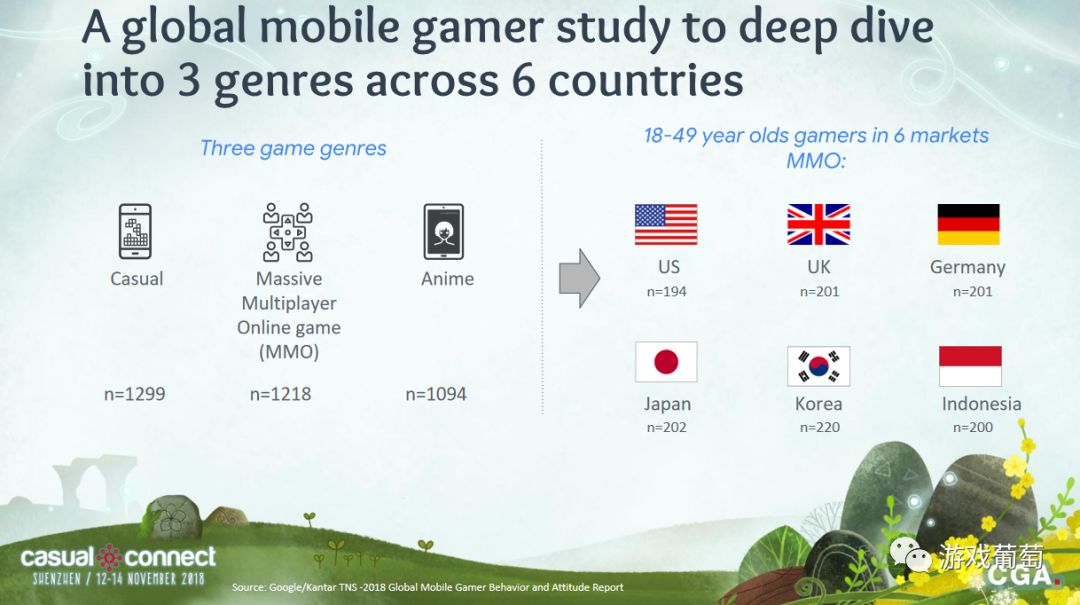 接下来要为大家展示的数据,是关于6个国家中最受欢迎的3个游戏种类(休闲、MMO和二次元)的统计。我们调查了美国、英国、德国、日本、韩国和印尼,并在其中看到了一些相似性。
