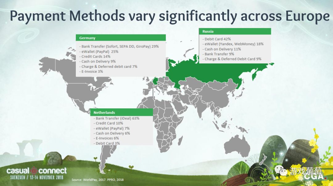 北欧有很多国家在说英语,德国、荷兰的用户对英语的掌握也比较好,法国和意大利用户也不错。但东欧和西欧相比,东欧用户对英语的掌握程度会比较低。因此当我们展开宣传攻势时,要针对某种特定的语言来进行。除了语言之外,厂商在支付方面也要做好本地化,必须牢记在某些国家会有特定的支付工具,必须知道在某个国家,最受欢迎的支付方式是哪一种。