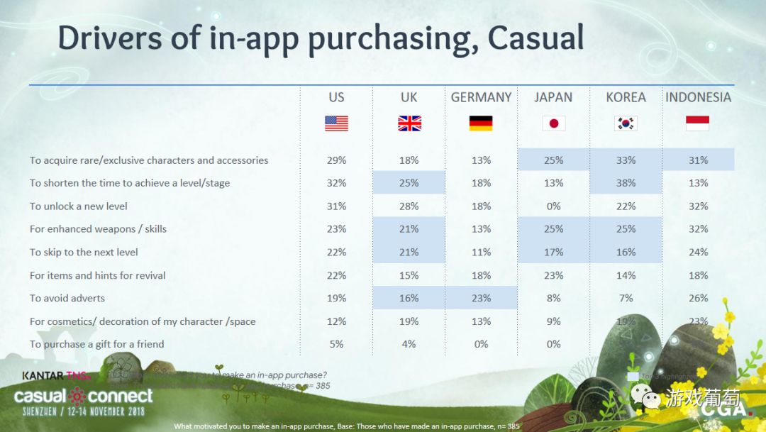与此同时,英国和日韩的玩家都愿意花钱升级武器、购买装备,但德国玩家却会认为,通过付费来变强,这会让他们觉得很不好意思,所以他们更愿意购买复活类的道具。