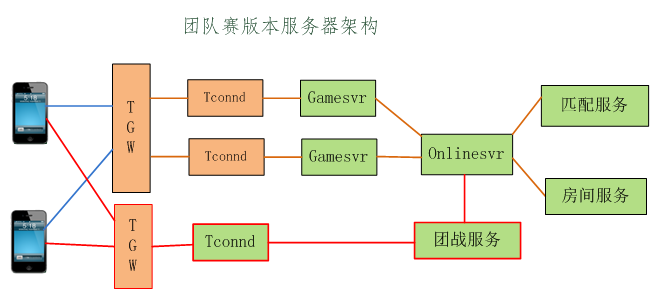 这是目前的游戏架构,增加了客户端与团战服务直接通讯的能力。3v3匹配成功后,通知团战服务建立房间,同时下发客户端房间所在团战服务的机器ip和端口(映射到tgw的vip和端口),客户端再通过下发的地址信息连接团战服务。游戏过程中,客户端直接向团战服务发同步包,团战服务转发给队伍中的其他玩家。