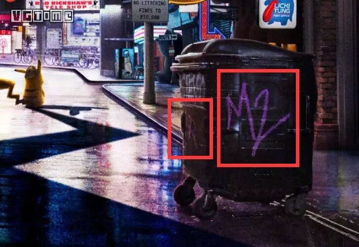 除了上面所提到的各种宝可梦主题的店铺之外,海报上还蕴藏了更加神秘的信息,那就是下图中垃圾箱上的“R”和“M2”字样。“R”在《精灵宝可梦》中指代的一般都是火箭队,而“M2”则指的是超梦,因为他的英文名是“Mewtwo”。