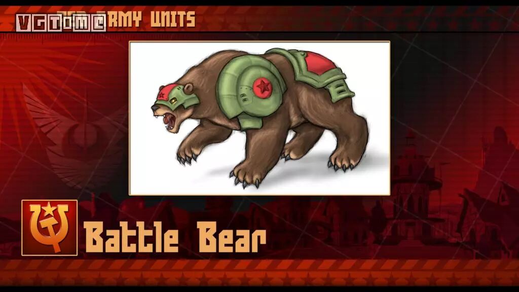 在人们的固有印象中,斯拉夫民族与棕熊本该就是天生一对。《红色警戒3》的苏俄阵营也有这么一种单位:战熊。虽然它主要负责战场上的侦查工作,但也能秒杀步兵、并对他们造成震慑。