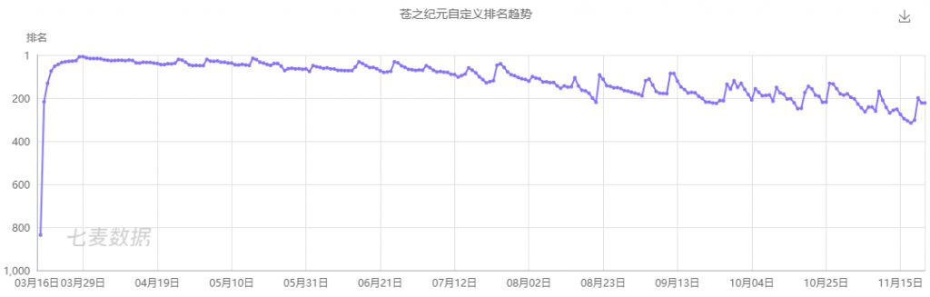 2018年3月《苍之纪元》上线,凭着“放置+二次元”的呈现方式成为市场黑马。该产品在上线两周内便进入iOS游戏畅销榜Top10,并在Top100内保持了近半年之久,整体而言的表现较为不错。