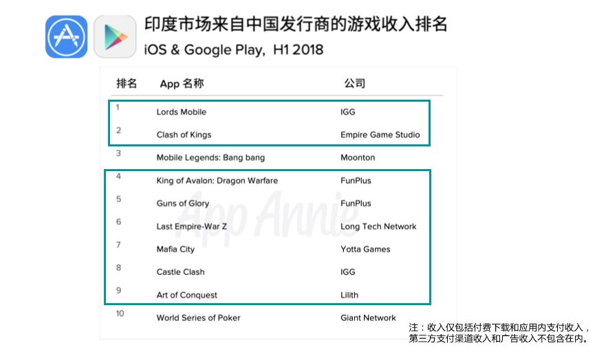 值得注意的是,在进入畅销榜TOP50的11款国产手游中,有8款都是SLG游戏,并且全都是“熟面孔”,比如《王国纪元》、《阿瓦隆之王》、《火枪纪元》等。而在App Annie发布的2018上半年印度市场来自中国发行商的游戏收入TOP10中,有8款SLG游戏。由此可见,在印度市场的重度手游领域探索上,中国厂商仍然是选择了稳妥的SLG类型。