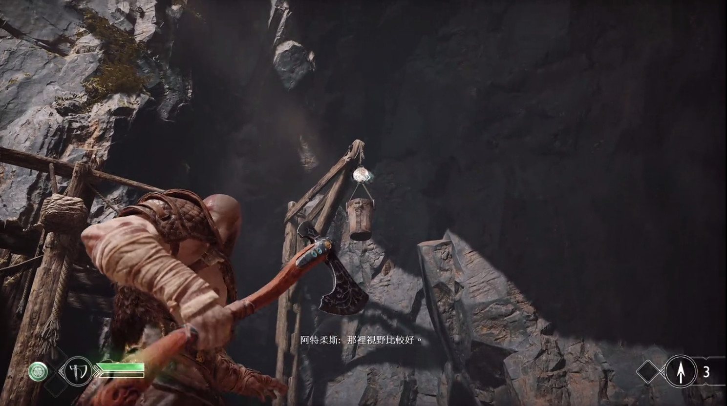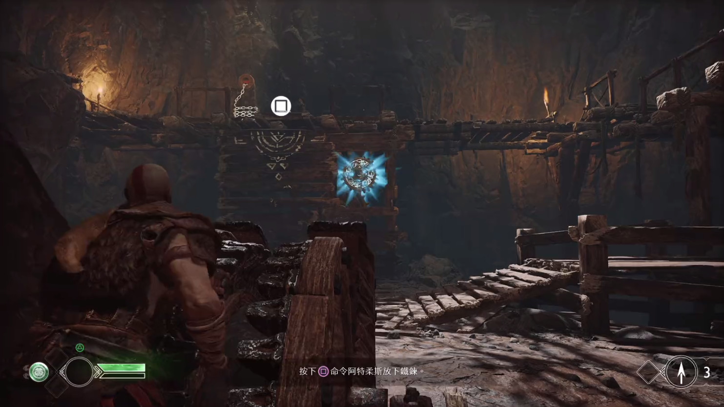 第二个让我惊艳的地方则是,当玩家控制奎托斯时,利维坦之斧是玩家跟场景物件交互的关键道具。玩家可以丢出斧头来跟场景里各种机关交互,通过投掷的频率、投掷时机、收回斧头的时机等等来进行关卡解谜。
