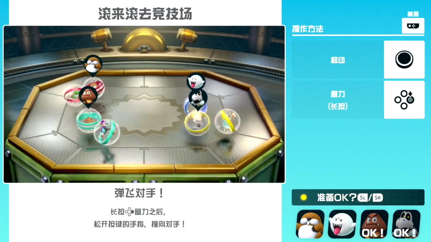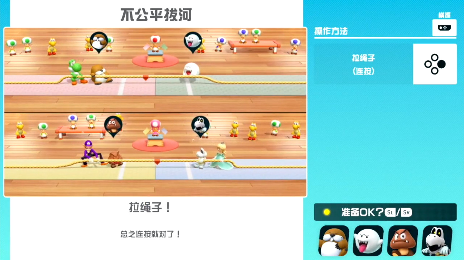 右侧是简单的文字介绍,左侧则是玩家们对应的屏幕,屏幕内就是该小游戏的试玩版,玩家拿着手柄就可以直接进行对应的操作。当所有玩家都觉得自己已经学会了之后,点击确认按钮,这时候才开始正式的比赛。